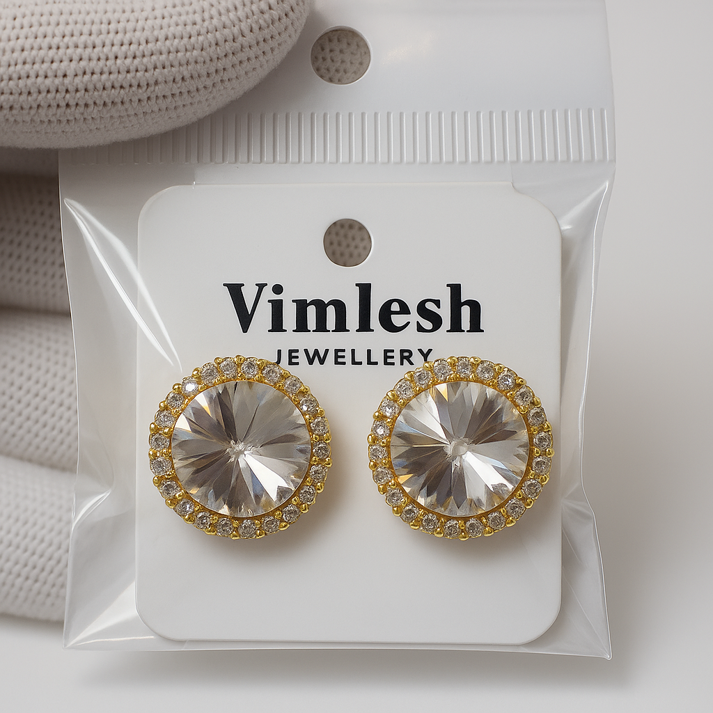 Add an instant touch of glamour with these Vimlesh Crystal Stud Earrings. Featuring a dazzling round-cut crystal at the center, surrounded by a ring of tiny shimmering stones, these earrings exude luxury and sophistication. Perfect for festive occasions, parties, or adding sparkle to your daily style.