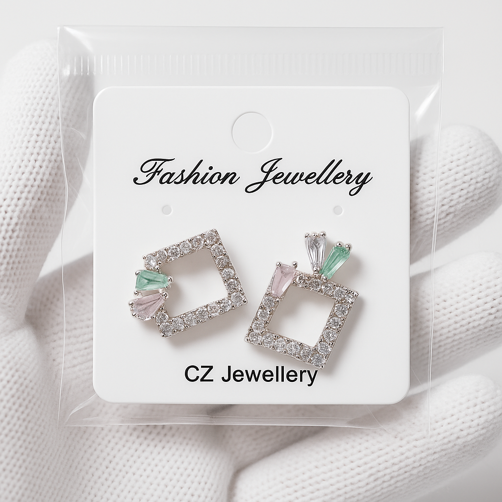Add instant sparkle to your look with these Fashion Jewellery Square Crystal Earrings. Designed with shimmering rhinestones and pastel accents in soft pink and mint tones, these earrings beautifully capture light from every angle. Perfect for elevating both casual and festive outfits with a touch of luxury.