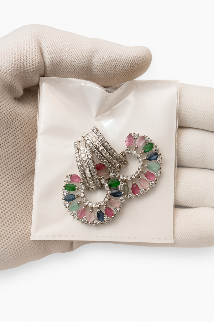 Each earring showcases a striking circle design adorned with hand-set stones in hues of emerald green, sapphire blue, rose pink, and icy mint — creating a sophisticated rainbow of luxury. This extraordinary blend makes it perfect for women who love to shine with grace, confidence, and color.