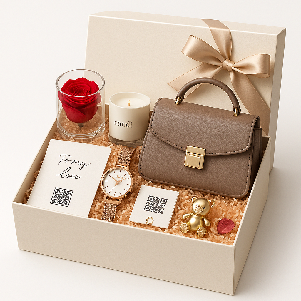 Includes personalized jewelry, candle, rose, treats, and your choice of a watch or handbag — all wrapped in satin and emotion.